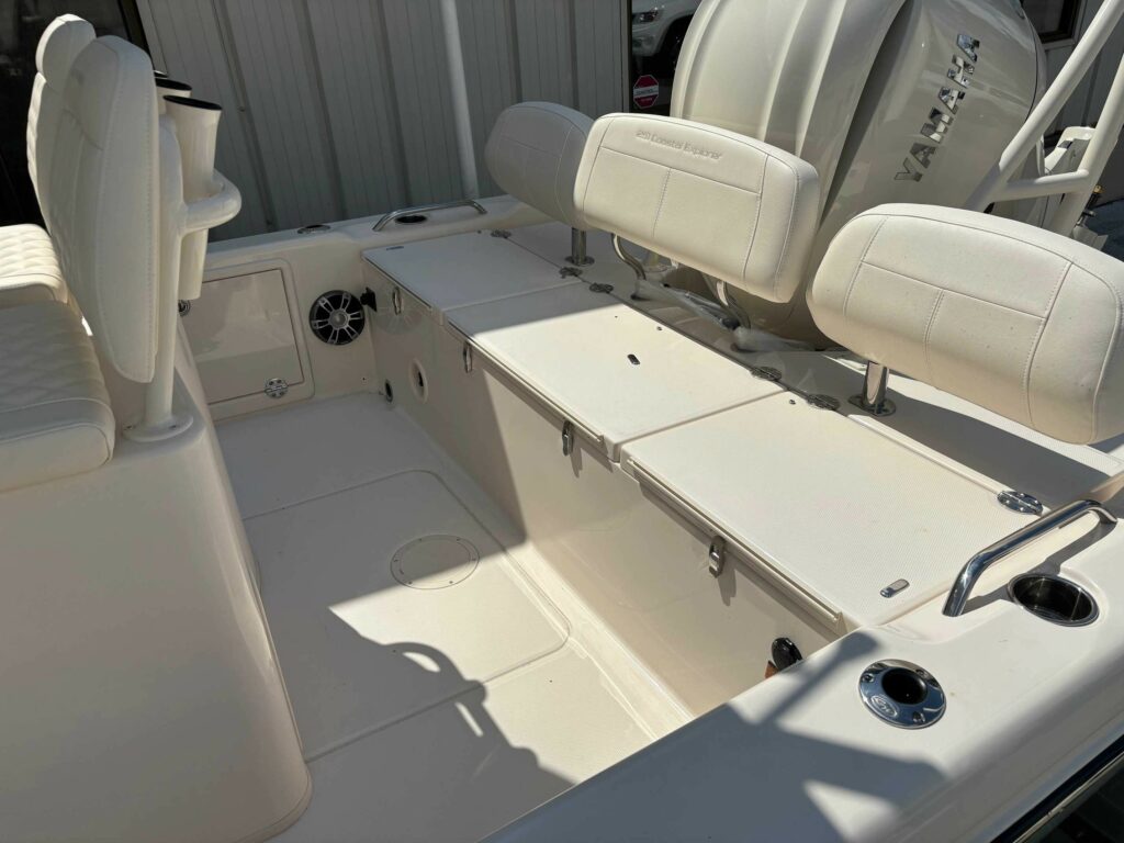 • Seating – Deluxe Lean Bar w/Backrest, Lockable Storage, Rod Holders (4), 25-Gallon (95 l) Insulated raw Water Livewell w/Light, Full Column Distribution Inlet & ob Drain (800 GPH Pump) (3028 LPH)