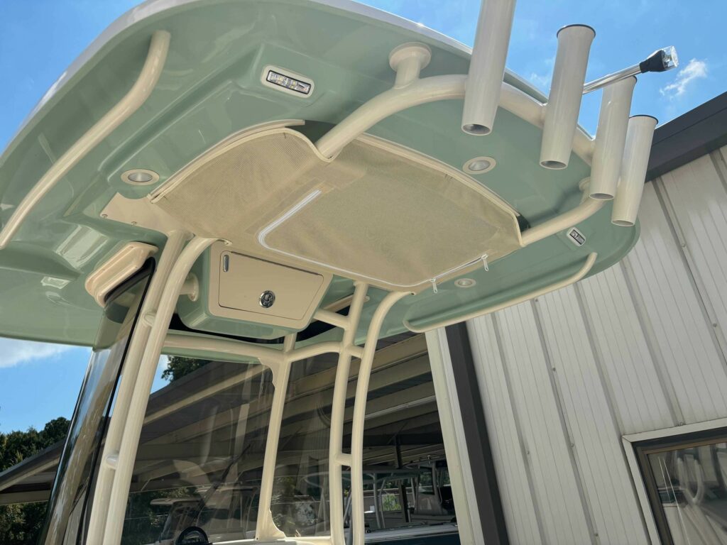 • T-Top w/Painted Aluminum Frame, Storage net, LED Spreader Lights, Rod Holders (4), tri-Colored (Red, Blue, White) LED Recessed Lights (3) & Radar Flat